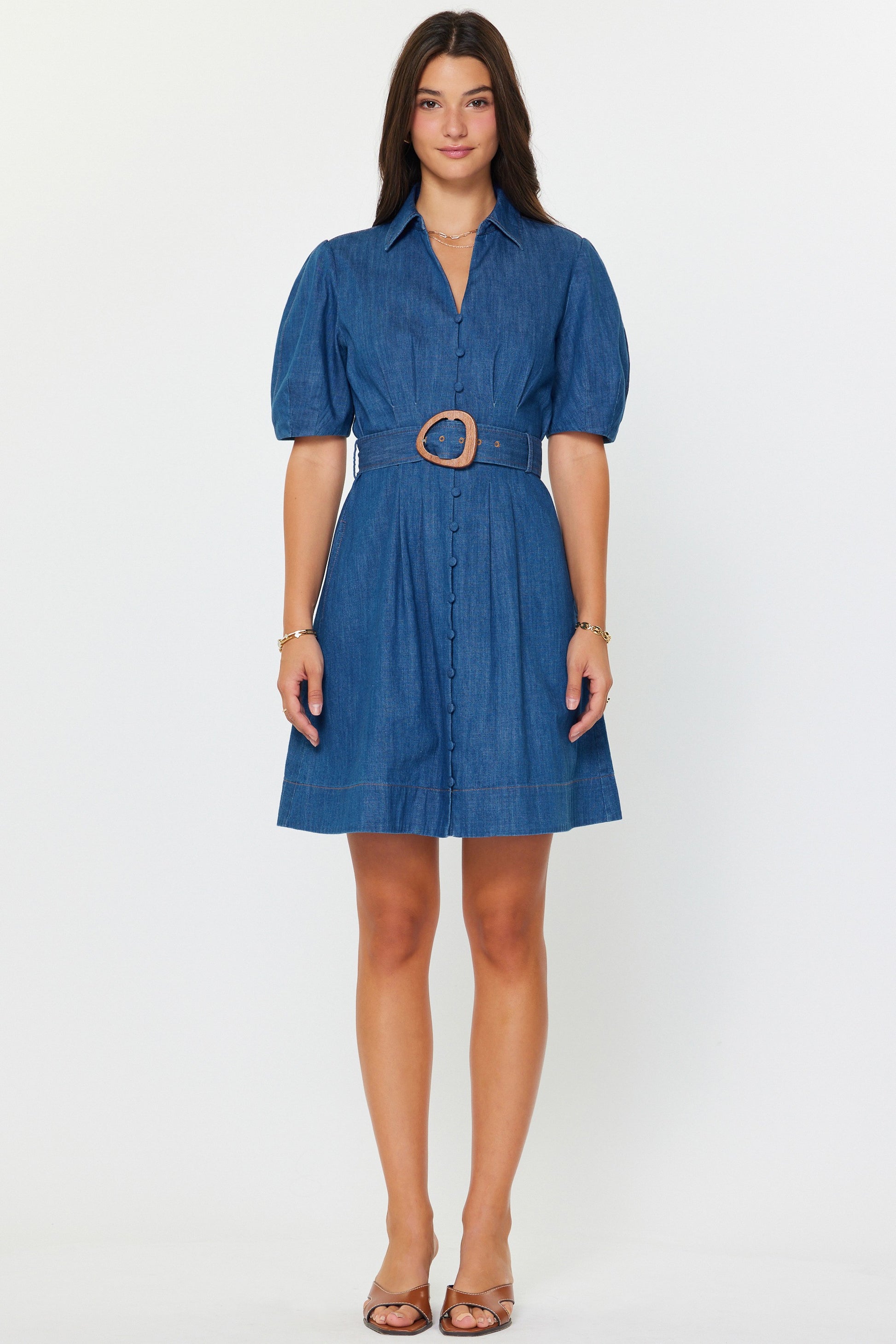 -Puff short sleeves with pleated detail for added volume -Split neckline with shirt collar -Button-down front -Fitted waist with front pleats -Wide buckle belt -Mini length with A-line silhouette -Gentle cycle wash in cold water