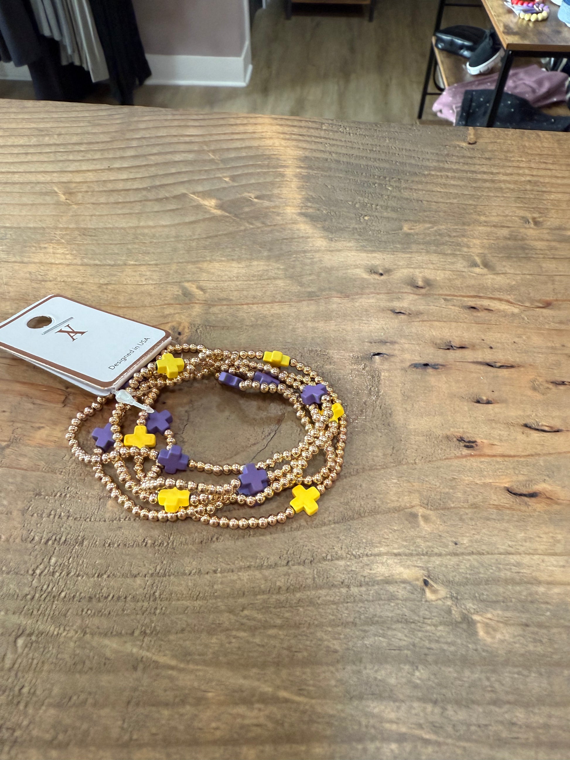 Gold Bead Purple/Yellow Cross Bead Stretch Bracelets (set of 5)