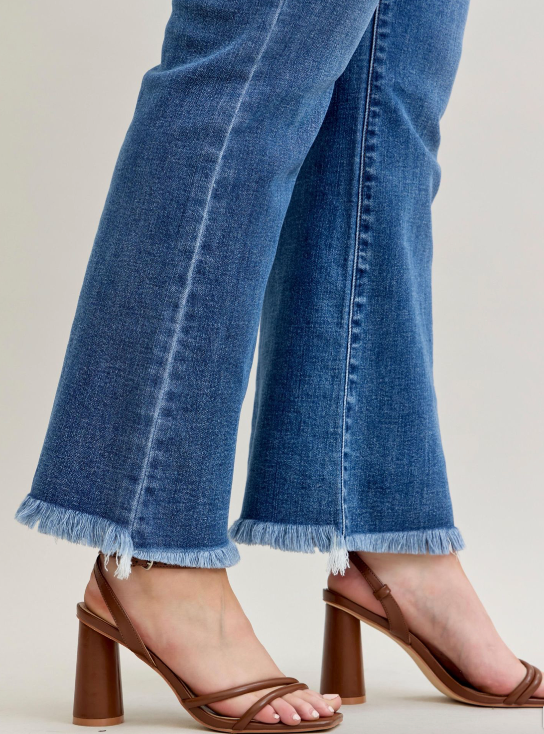 HW Bootcut Double Button WB & Fray HemRise: 12 3/4"Inseam: 32"MODEL INFO - Wearing a Judy Blue Size: 14WHeight: 5'10Waist: 36"Hips: 50"