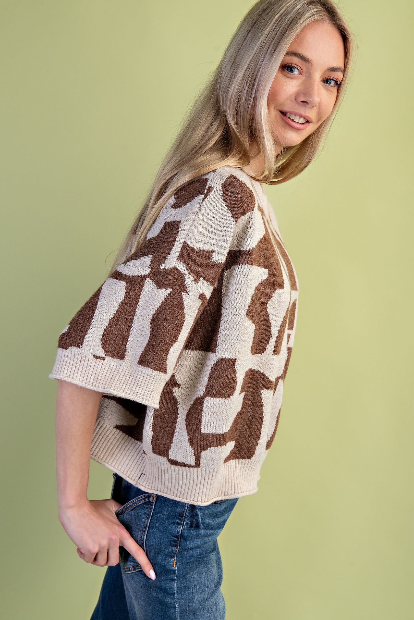 Short Sleeve Geometric Print Sweater Model is 5'8" wearing a small.