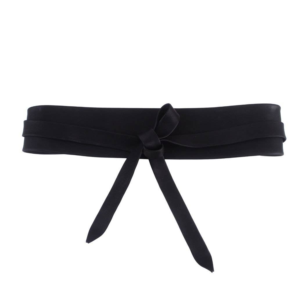 This wrap belt is a staple accessory piece within every woman's wardrobe. This one size fits all belt wraps around the waist and flatters the female physique. The available color options for this leather belt include black, brown, and camel.