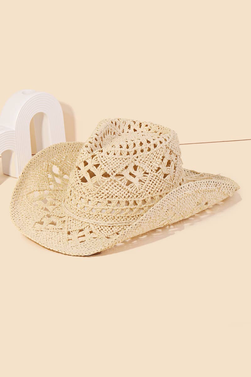 Make a bold statement, this sun hat includes a stunning straw braided cowboy design. Achieve a perfect blend of style and sophistication with this versatile sun hat, a fashion-forward choice for any occasion. Available in IV, KA. This item is sold in packs of 1.